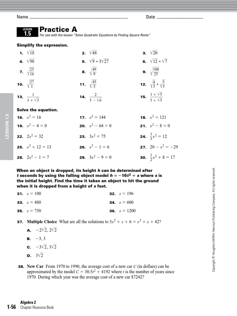 PDF Quadratic Functions and Equations Name ... - Math 20-2 A quadratic function has x-intercepts of (-3,0) and (5,0). This function passes through the point ( ) The factored format of a quadratic equation is: ( )( ). The value of a that satisfies this quadratic function, to the nearest hundredth is _____. Record your answer to two decimal places on the answer sheet. 7. Did You Hear About Math Worksheet Quadratic Equations Answers Algebra 2 Worksheet Answers . Ad bring learning to life with thousands of worksheets, games, and more from education.com. Did you hear about math worksheet quadratic equations answers. Students can utilize fractions, decimals, and integers to solve problems, write equations, and analyze formulas.