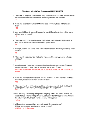 Christmas Math Word Problem Worksheets - ThoughtCo The amount of practice your students have working with word problems affects their confidence level in this area. Design Christmas word problem worksheets that are suitable for second and third-grade students. The sample questions adhere to math standards for those grades. Most of these word problems focus on number sense.